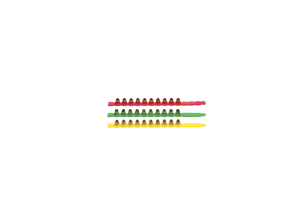Cartuchos de fixação à pólvora ação indireta magazinados com dez unidade por pente. Cada cor possui um nível de potência para aplicações em diferentes materiais base.